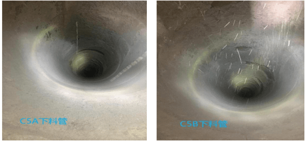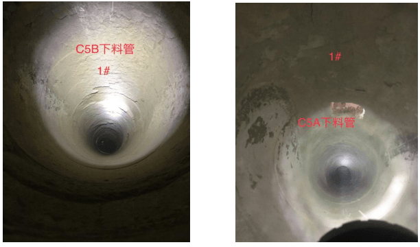 結合水泥廠工藝實際情況,經報集團技術服務部批準,該水泥廠最終決定采用耐火科技生產研發的“新型氮化硅微晶下料管”。經過為期一年的使用后,雙方對微晶下料管進行檢查,結果發現下料管壁內完好、整體未見明顯結皮,C5A 下料管錐部轉彎處有少許懸掛料,但不大于 1cm,整體效果比較完好,并且未發生因 C5 下料管結皮堵塞導致的停窯事故,保證了窯系統的安全運行,檢查結果如下圖。