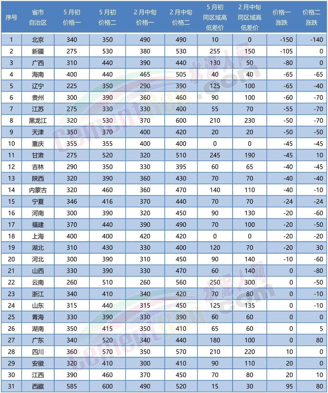 相對較高價中北京、山西、貴州、江蘇、黑龍江、海南、河南、河北、天津、福建、云南、重慶、吉林、遼寧、陜西、寧夏、上海、內蒙古、浙江、山東20個區域環比2月中旬報價下跌10-140元/噸;新疆、廣西、青海、四川、安徽5個地區環比2月中旬持平;湖南、甘肅、江西、湖北、廣東、西藏6個地區環比2月中旬回升5-80元/噸。