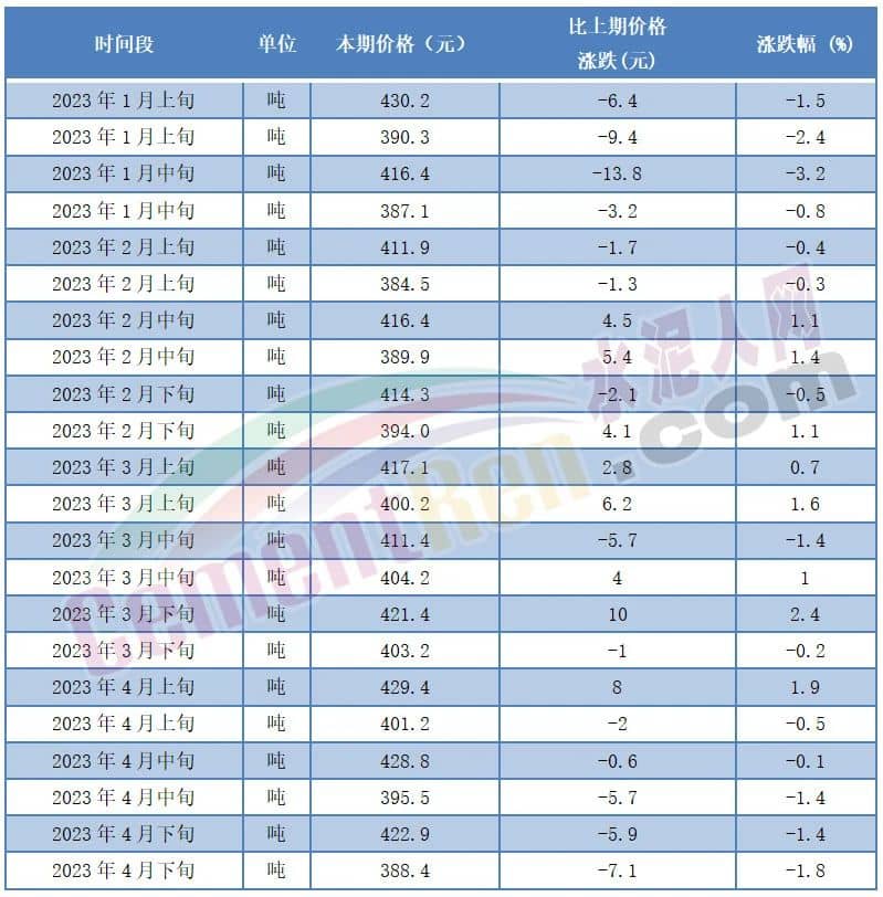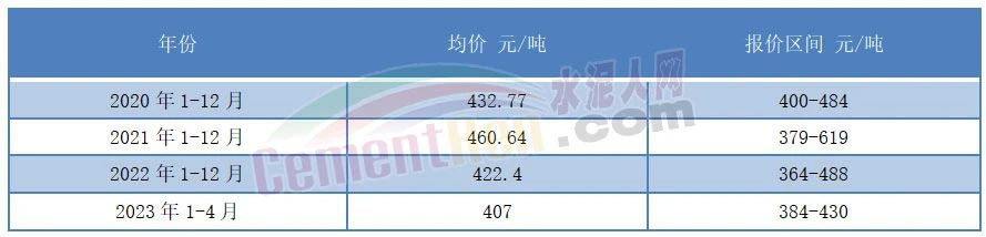 從水泥價(jià)格方面來看,2023年在煤炭?jī)r(jià)格大幅上漲的背景下,2023年1-4月流通領(lǐng)域P.O42.5散裝水泥均價(jià)為407元/噸,各時(shí)間段報(bào)價(jià)在384-430元/噸之間波動(dòng),且多個(gè)時(shí)間段水泥價(jià)格在400元/噸以下。