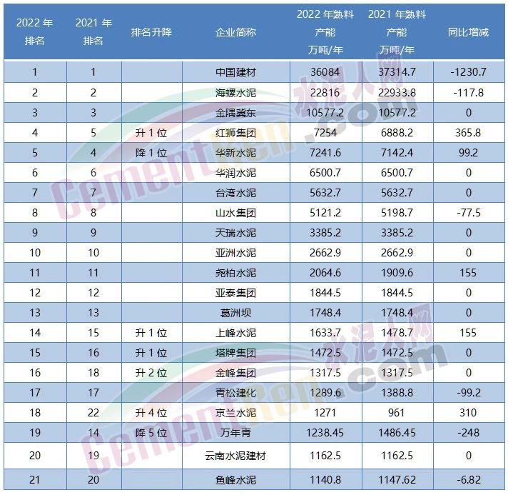 究竟是哪家企業(yè)在新增產(chǎn)能,又是哪家在淘汰落后?從水泥行業(yè)前20大集團(tuán)近兩年產(chǎn)能情況來看,2021~2022年里前20大集團(tuán)中紅獅水泥、華新水泥、堯柏水泥、上峰水泥、京蘭水泥產(chǎn)能均有所增加。