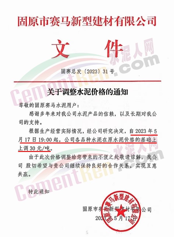 寧夏賽馬水泥有限公司通知,根據(jù)生產(chǎn)經(jīng)營(yíng)實(shí)際情況,經(jīng)公司研究決定,自2023年5月17日10時(shí)起公司各品種水泥在原價(jià)格基礎(chǔ)上上調(diào)50元/噸。