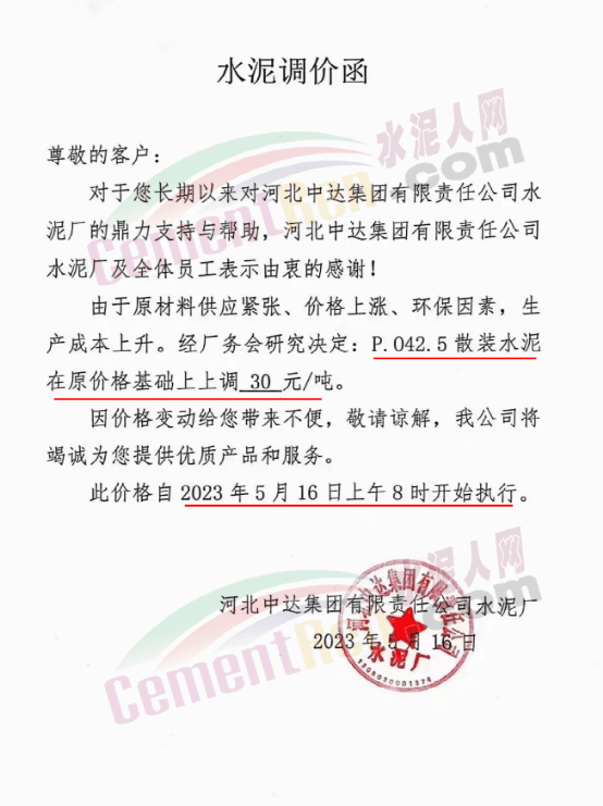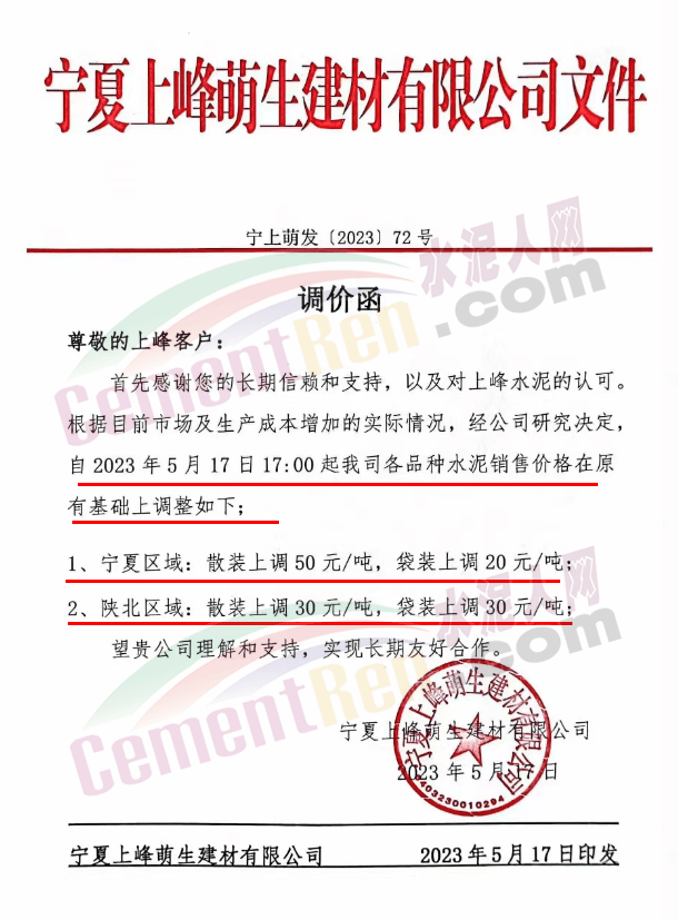 同日,蒲城堯柏特種水泥有限公司通知,為了響應(yīng)夏季錯(cuò)峰生產(chǎn)政策,造成公司原材料上漲,生產(chǎn)成本增加,為保證持續(xù)向客戶提供高品質(zhì)產(chǎn)品和服務(wù)。經(jīng)公司研究決定:自5月17日0時(shí)起,對(duì)所有袋裝水泥出廠價(jià)格在原價(jià)基礎(chǔ)上上調(diào)40元/噸;散裝水泥出廠價(jià)格在原價(jià)基礎(chǔ)上上調(diào)30元/噸。