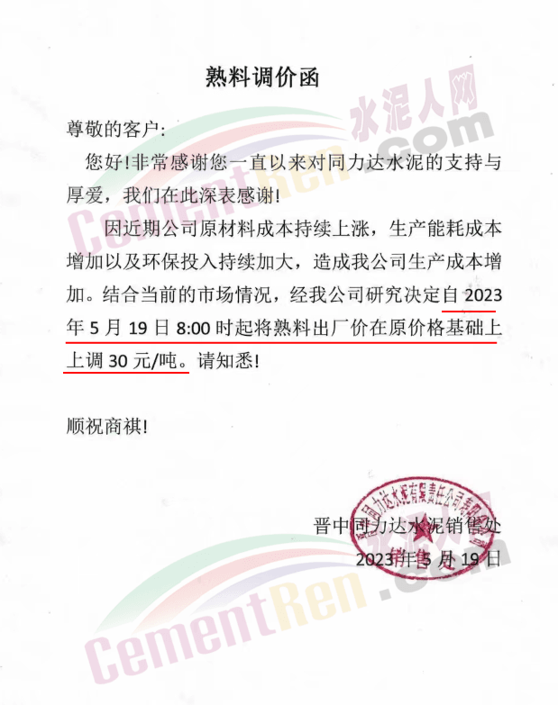 晉中同力達水泥銷售處通知,因近期公司原材料成本持續上漲,生產能耗成本增加以及環保投入持續加大,造成公司生產成本增加。結合當前的市場情況,經公司研究決定自5月19日8時起將熟料出廠價在原價格基礎上上調30元/噸。