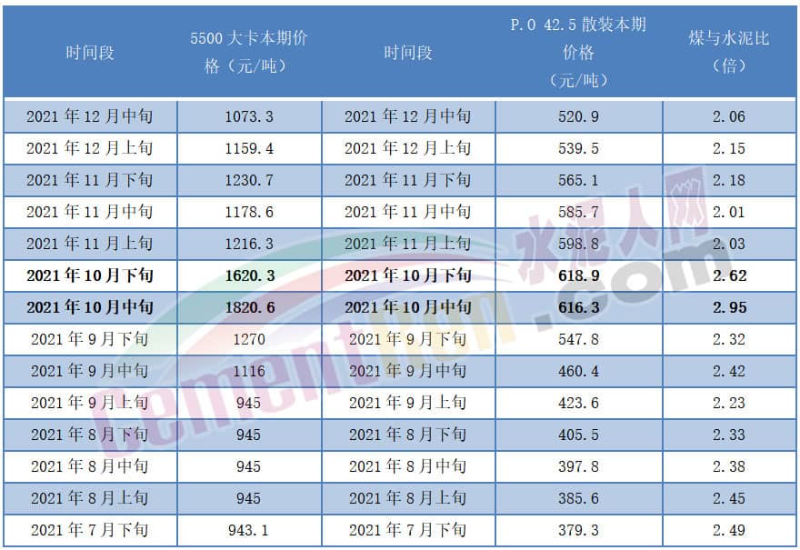 國家統計局公布的數據顯示,2021年10月中下旬5500大卡煤炭報價1600元/噸以上的時候,水泥價格也漲至當年最高點610元/噸以上。且自7月下旬到12月中旬,煤價一直是水泥價格的兩倍多。