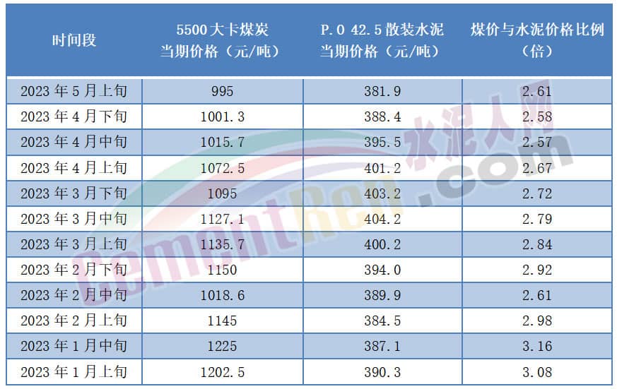 今年1月上旬~5月上旬,5500大卡煤炭與P.O42.5散裝水泥價格比例也多在2倍多。也就是說煤價調整的同時水泥價格也在調整,其比例一直較穩定。今年煤價微降,水泥價格跌至近五年新低,水泥跌價與煤炭跌價出現脫鉤跡象,水泥下跌幅度明顯比煤炭幅度要大。