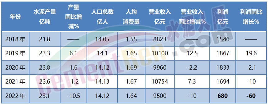 從國家統計局近年來公布的建材行業經濟運行情況來看,水泥產量一直處于平臺期,人均消費量在1.5~1.7噸之間,2018~2021年利潤也多在1000億元左右,而2022年卻直降60%至680億。從數字上來看,需求并沒有大幅減少,但利潤直線下跌。