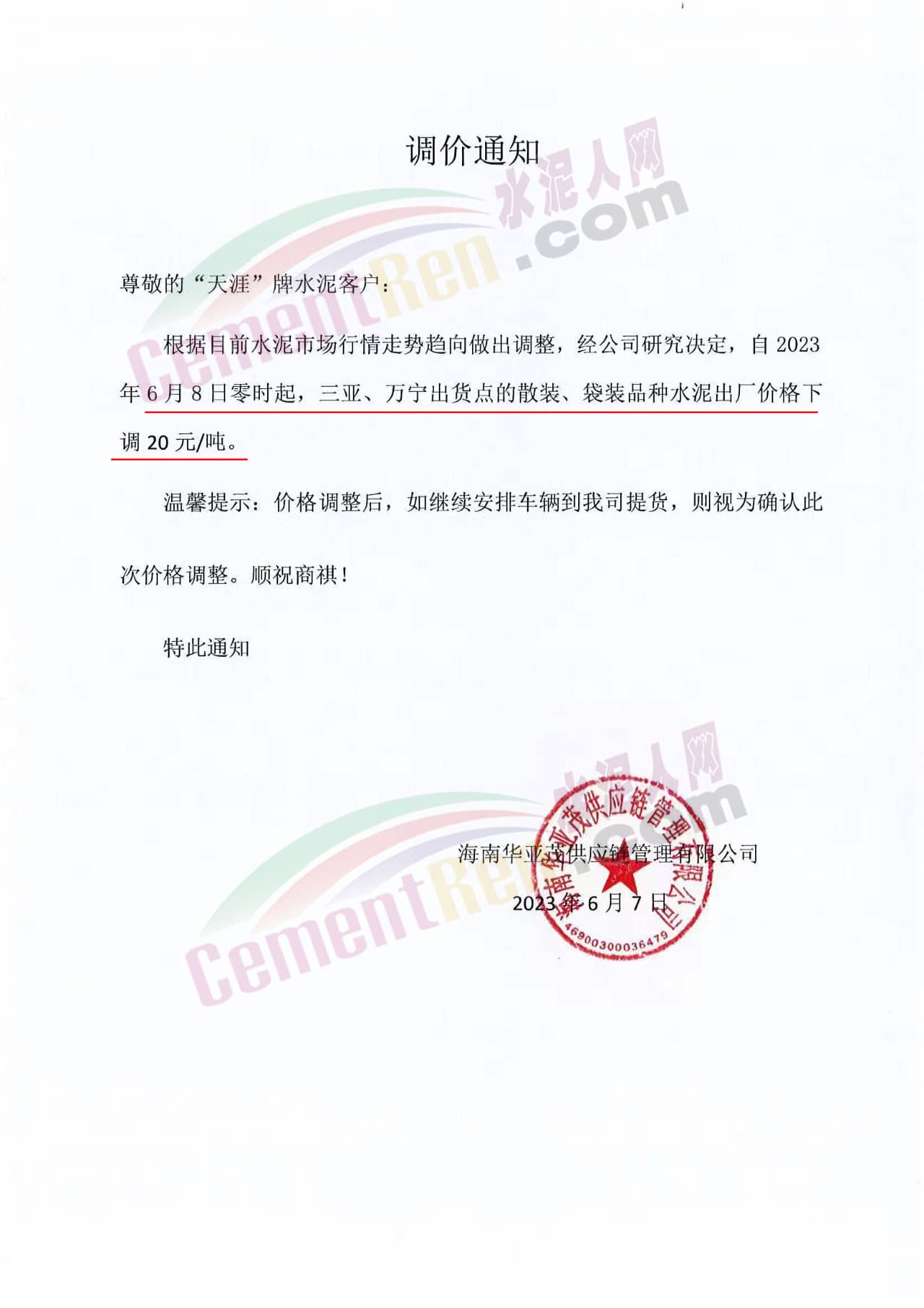 海南鑫華海茂供應鏈管理有限公司通知根據目前水泥市場行情走勢趨向做出調整,經公司研究決定,自2023年6月8日零時起,澄邁、文昌、瓊海出貨點的散裝、袋裝品種水泥出廠價格下調20元/噸。