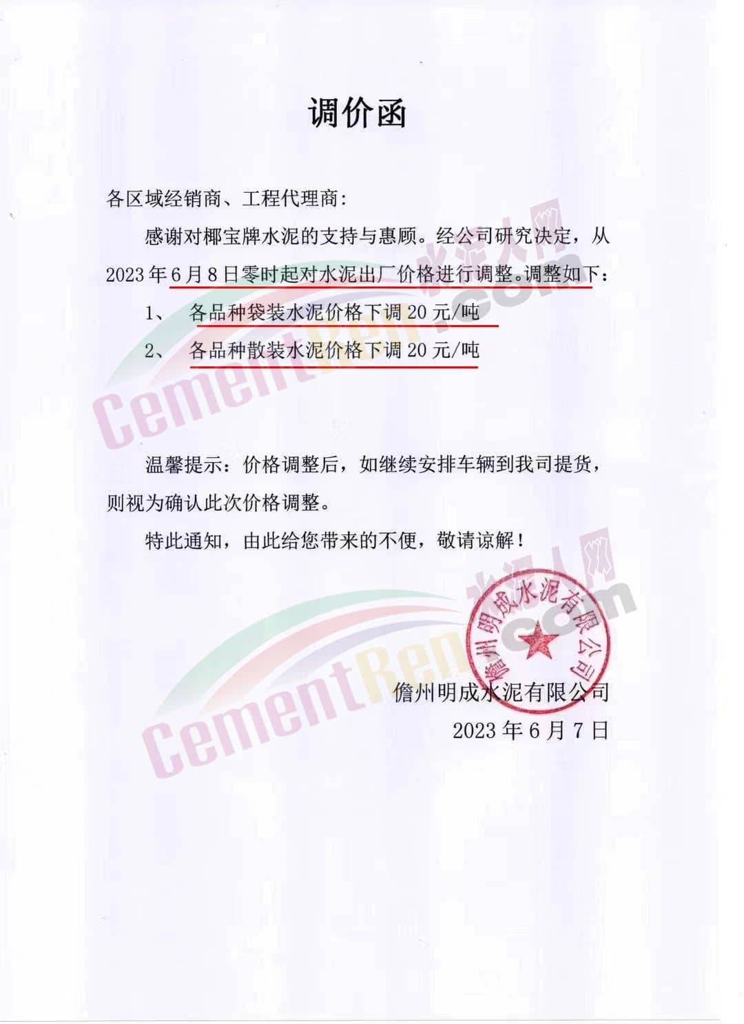同期儋州明成水泥有限公司發函通知從2023年6月8日零時起對“椰寶”牌水泥出廠價下調20元/噸。