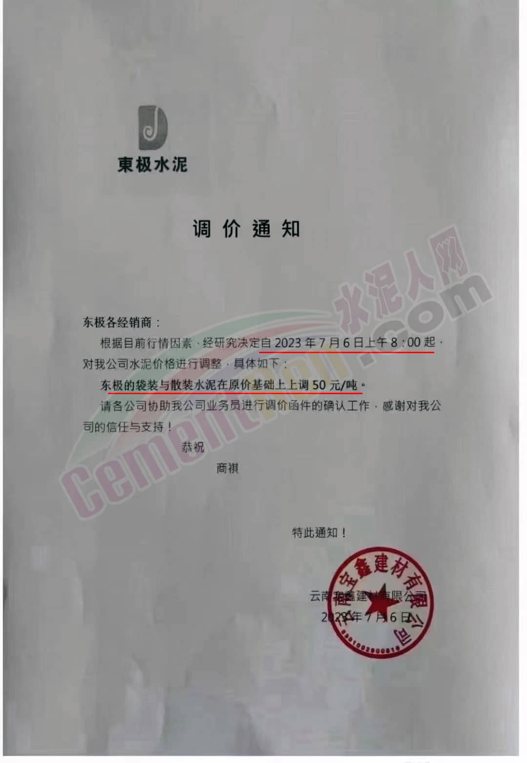華新水泥(富民)有限公司通知,因原材料大幅度上漲影響,導致工廠成本大幅提升,經公司慎重研究決定:自2023年7月7日8時起,華新水泥(富民)有限公司對所有品種水泥及熟料在原執行價格基礎上上調50元/噸。