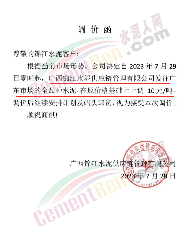 另據了解,該企業此前曾通知自7月29日零時起,上調發往廣東市場的全品種水泥10元/噸。