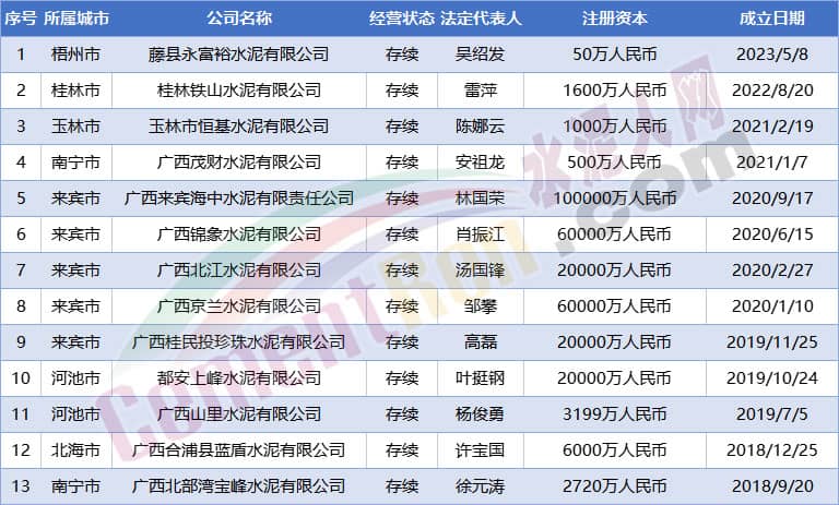 水泥人網注意到新成立企業中包含近年來新增產能較大的廣西區域,新成立企業包含知名企業廣西來賓海中水泥有限責任公司、廣西錦象水泥有限公司、廣西北江水泥有限公司、廣西京蘭水泥有限公司、都安上峰水泥有限公司等13家水泥公司。