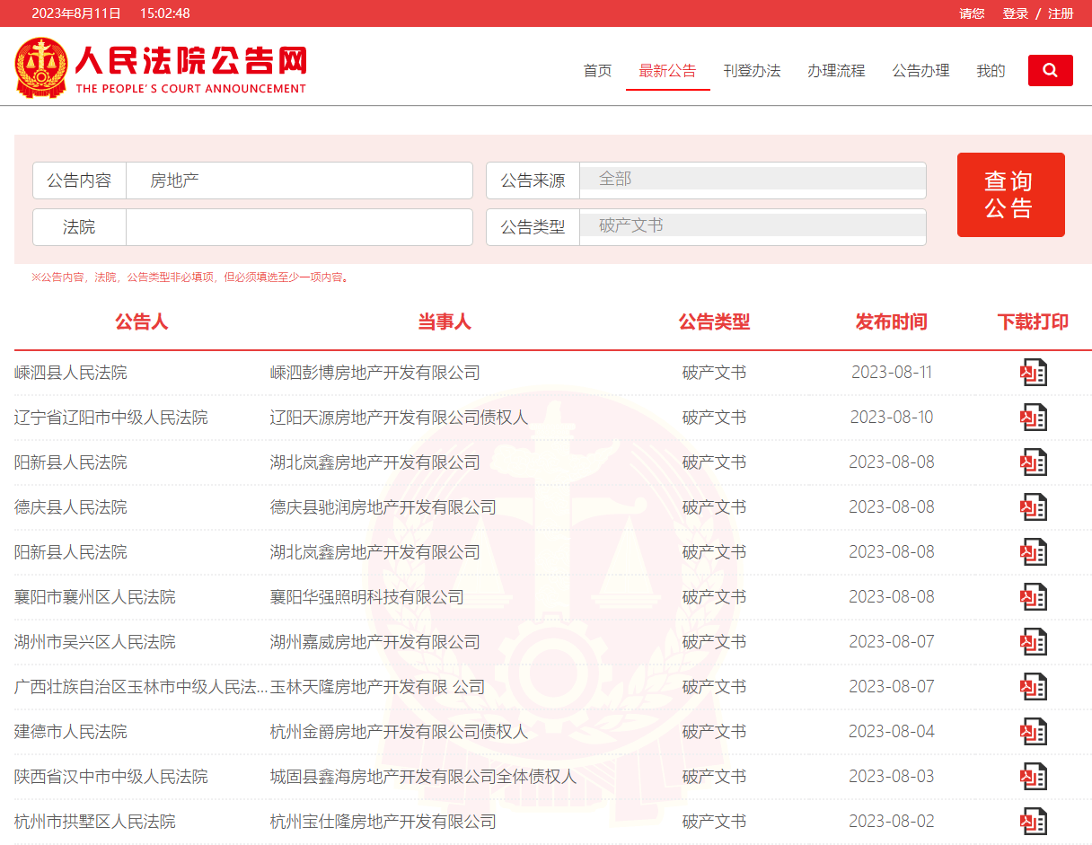 據(jù)人民法院公告網(wǎng)數(shù)據(jù),2023年以來截至發(fā)稿,已有175家房地產(chǎn)相關(guān)企業(yè)發(fā)布了破產(chǎn)公告。有的因?yàn)闊o法清償?shù)狡趥鶆?wù),有的負(fù)債過高,有的資金鏈斷裂,最終紛紛申請(qǐng)破產(chǎn)清算,名下房產(chǎn)、土地慘遭處理。