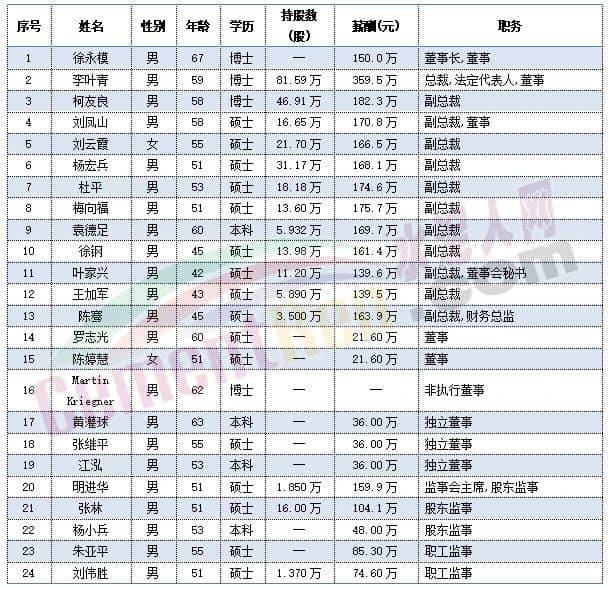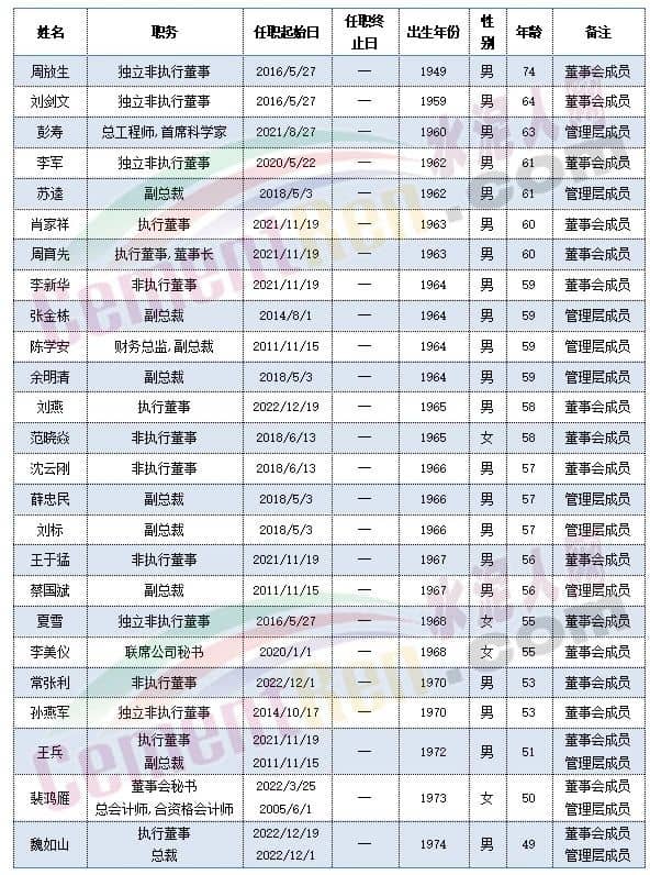 中國建材董事會成員及管理層成員中包括執行總裁肖家祥,非執行董事李新華在內的多位高管年齡處于59-60歲之間。