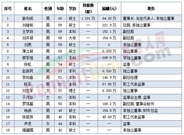 祁連山董事長脫利成今年60歲,總裁劉繼彬、副總裁王學政今年59歲,副總裁劉開祿今年58歲。