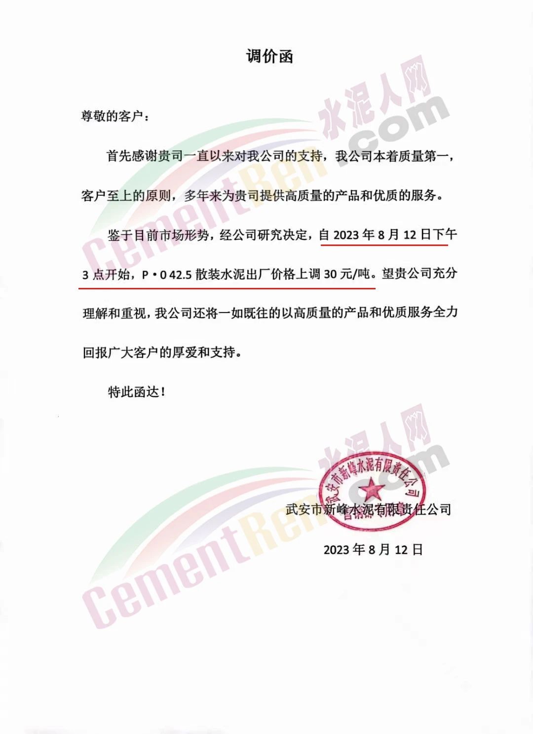 日前,武安市新峰水泥有限責(zé)任公司通知,鑒于目前市場形勢,經(jīng)公司研究決定,自2023年8月12日下午3點(diǎn)開始,P.O42.5散裝水泥出廠價(jià)格上調(diào)30元/噸。