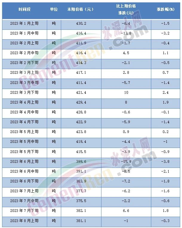 8月14日,國家統(tǒng)計(jì)局發(fā)布的2023年8月上旬流通領(lǐng)域重要生產(chǎn)資料市場價(jià)格變動(dòng)情況顯示,普通硅酸鹽水泥(P.O42.5散裝)水泥報(bào)價(jià)311.7元/噸,且為自5月上旬以來第10次突破年內(nèi)最低價(jià)。