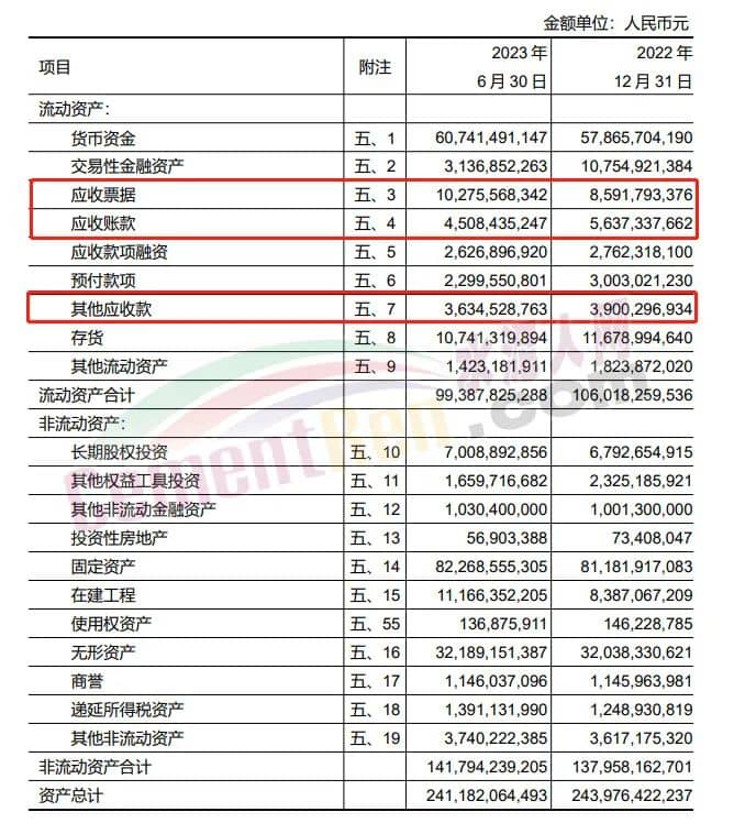 2023年上半年天瑞水泥應收賬款2.42億,應收票據96.1億,其他應收款3.22億。
