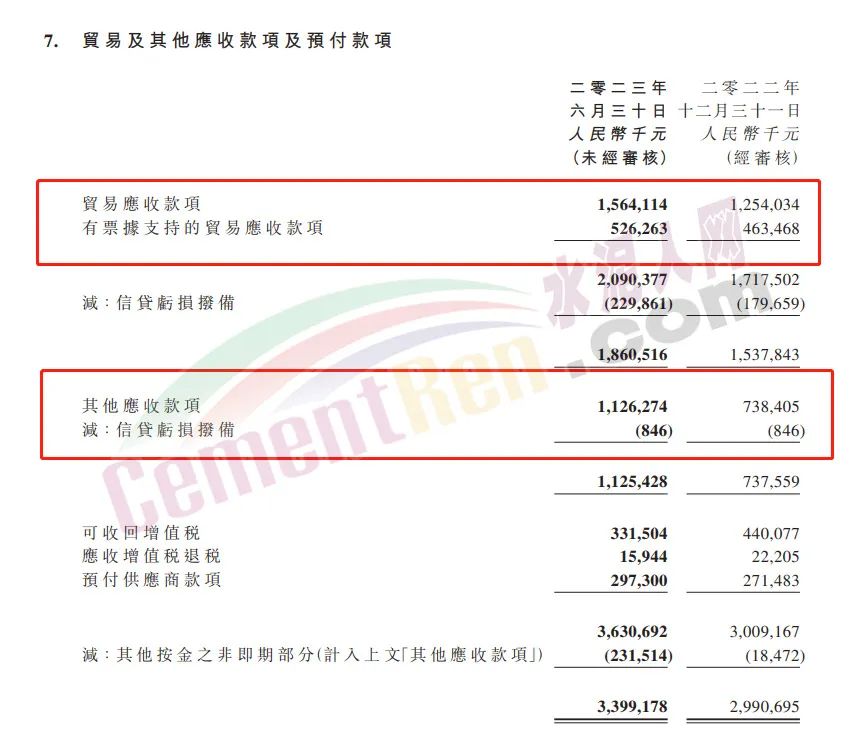 2023年上半年華潤水泥應收賬款33.16億。