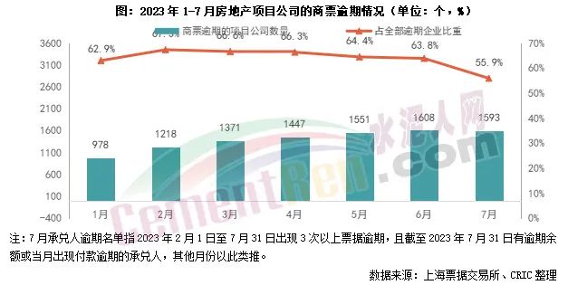 水泥企業這些票據賬款中有多少是房地產企業的,我們無從得知,但是看看房地產行業的情況就能發現,情況不容樂觀。據票交所公布的《截至2023年7月31日承兌人逾期名單》,2023年2月末到7月末發生3次以上商票逾期,且月末有逾期余額或當月出現票據逾期行為的房地產項目公司數量1593個,占全部商票逾期企業的比重為55.9%。