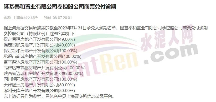 隆基泰和債務爆雷始于2021年底,旗下隆基泰和置業出現商票逾期,有10多筆商票拒付。直至今日,隆基泰和置業仍在上海票交所公布的“持續逾期名單”中。截至2023年6月30日,隆基泰和置業有限公司商票逾期5373.35萬元,累計逾期發生額6300.44萬元。