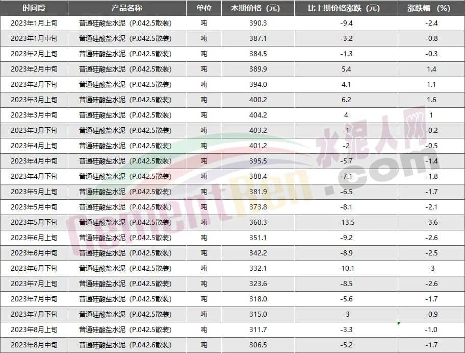 近日,國家統計局公布2023年8月中旬流通領域重要生產資料市場價格變動情況顯示,普通硅酸鹽水泥(P.O42.5散裝)水泥報價306.5元/噸,已是自3月下旬以來連續第15次價格下跌,且為自5月上旬以來第11次突破年內最低價。