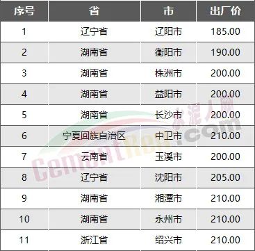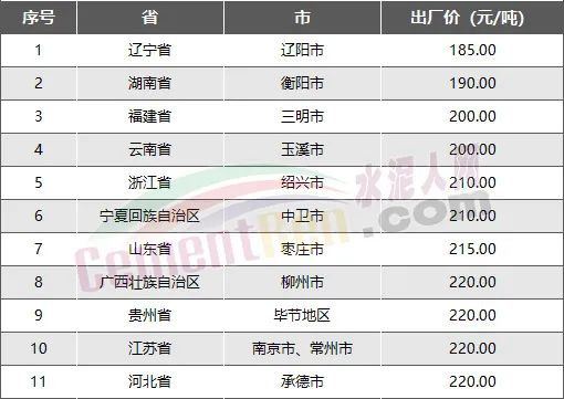 全國PO42.5散裝水泥價格最低的前10個省市為遼寧省、湖南省、福建省、云南省、浙江省、寧夏回族自治區、山東省、廣西壯族自治區、貴州省、江蘇省、河北省,P.O42.5散裝水泥出廠報價均在220元/噸以下。