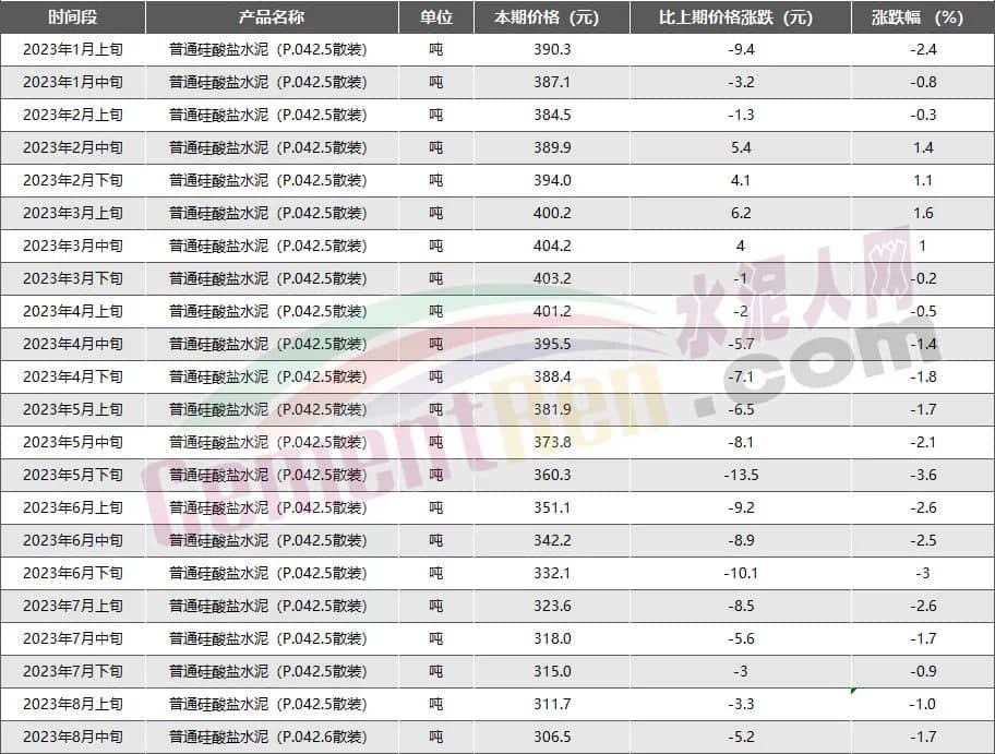 近日,國(guó)家統(tǒng)計(jì)局公布2023年8月中旬流通領(lǐng)域重要生產(chǎn)資料市場(chǎng)價(jià)格變動(dòng)情況顯示,普通硅酸鹽水泥(P.O42.5散裝)水泥報(bào)價(jià)306.5元/噸,已是自3月下旬以來(lái)連續(xù)第15次價(jià)格下跌,且為自5月上旬以來(lái)第11次突破年內(nèi)最低價(jià)。 圖片