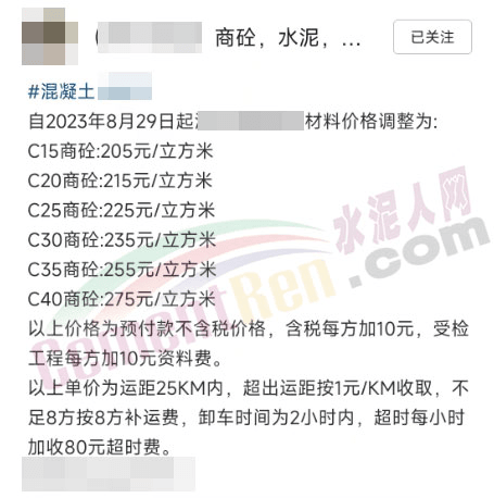 山東一家商砼站通知,自8月29日起調(diào)整材料價格。并提示報價為預付款不含稅價格,含稅每方再加10元,受檢工程每方再加10元資料費。單價為運距25公里內(nèi),超出運距按1元/公里收取,卸車時間為2小時內(nèi),超時每小時加收80元超時費。