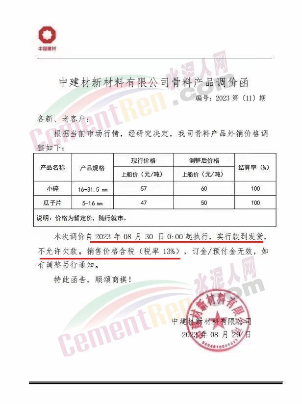 中建材新材料有限公司通知,根據(jù)當前市場行情經(jīng)研究決定,公司骨料產(chǎn)品小碎16-31.5mt及瓜子片5-16m外銷價格,自8月30日0時起上調(diào)3元/噸。實行款到發(fā)貨,不允許欠款。銷售價格含稅(稅率13%),訂金/預付金無效。