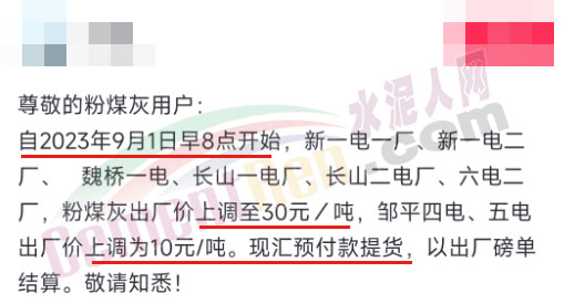 據(jù)山東貿(mào)易商通知,自2023年9月1日早8點開始,新一電一廠、新一電二魏橋一電、長山一電廠、長山二電廠、六電二廠,粉煤灰出廠價上調(diào)至30元/噸,鄒平四電、五電出廠價上調(diào)為10元/噸。現(xiàn)匯預付款提貨,以出廠磅單結(jié)算。