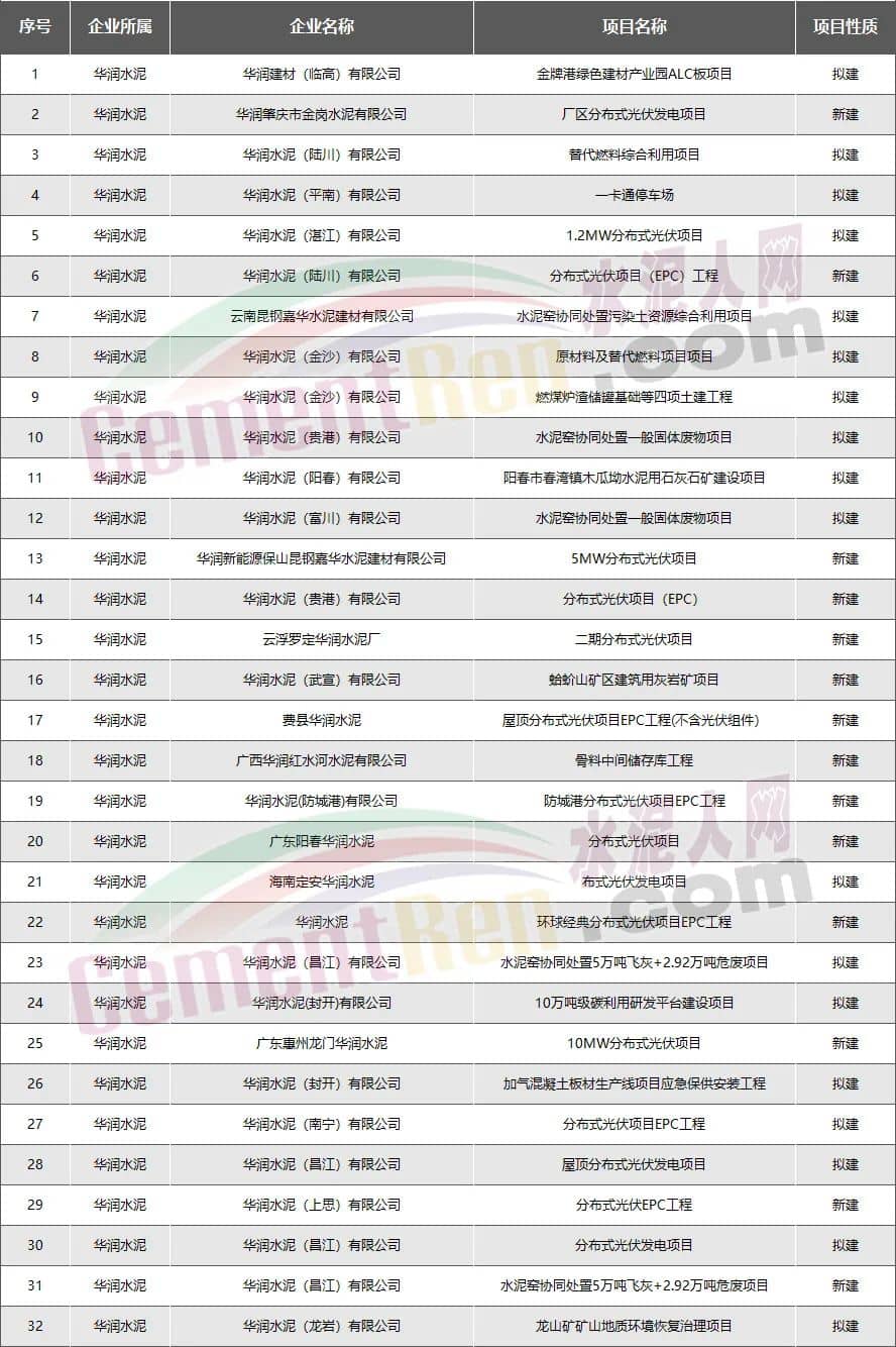 據(jù)水泥人網(wǎng)不完全統(tǒng)計,2023年下半年以來,中建材集團、海螺水泥、華新水泥、華潤水泥、金隅集團、紅獅控股集團、山水水泥、臺泥水泥旗下共有304個新建擬建項目,其中光伏、骨料、混凝土、水泥窯協(xié)同處置、智能化相關項目居多。