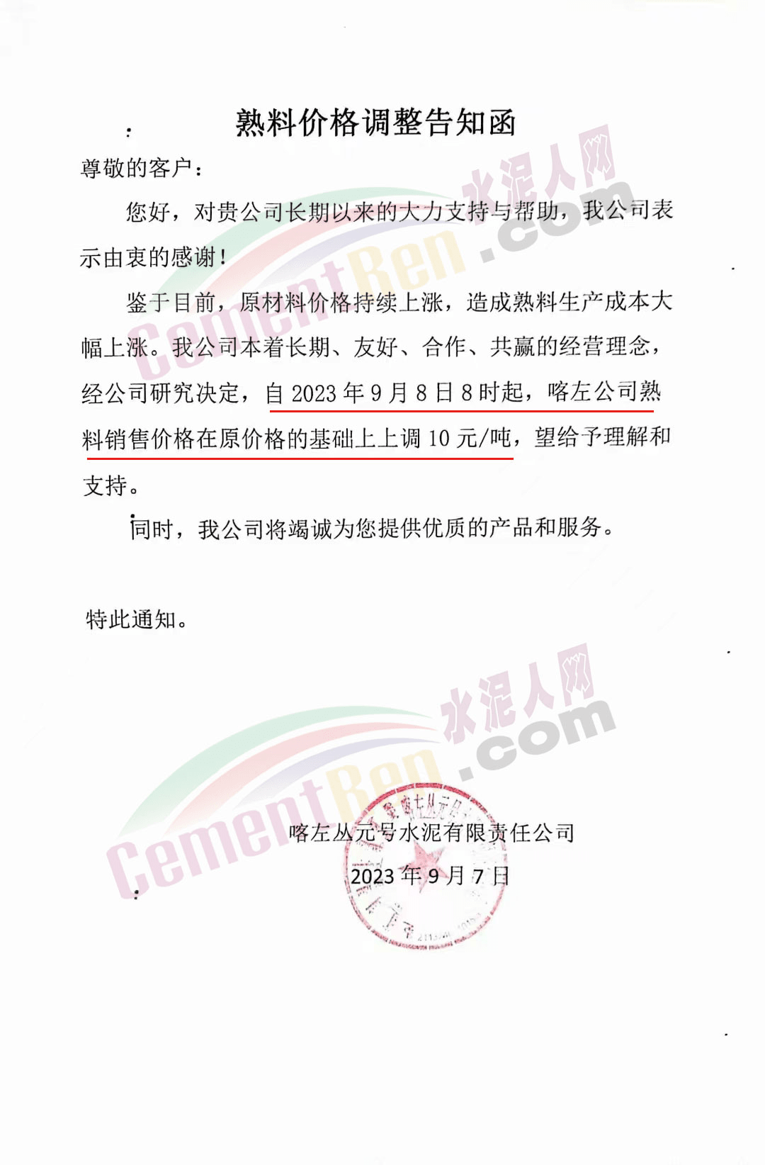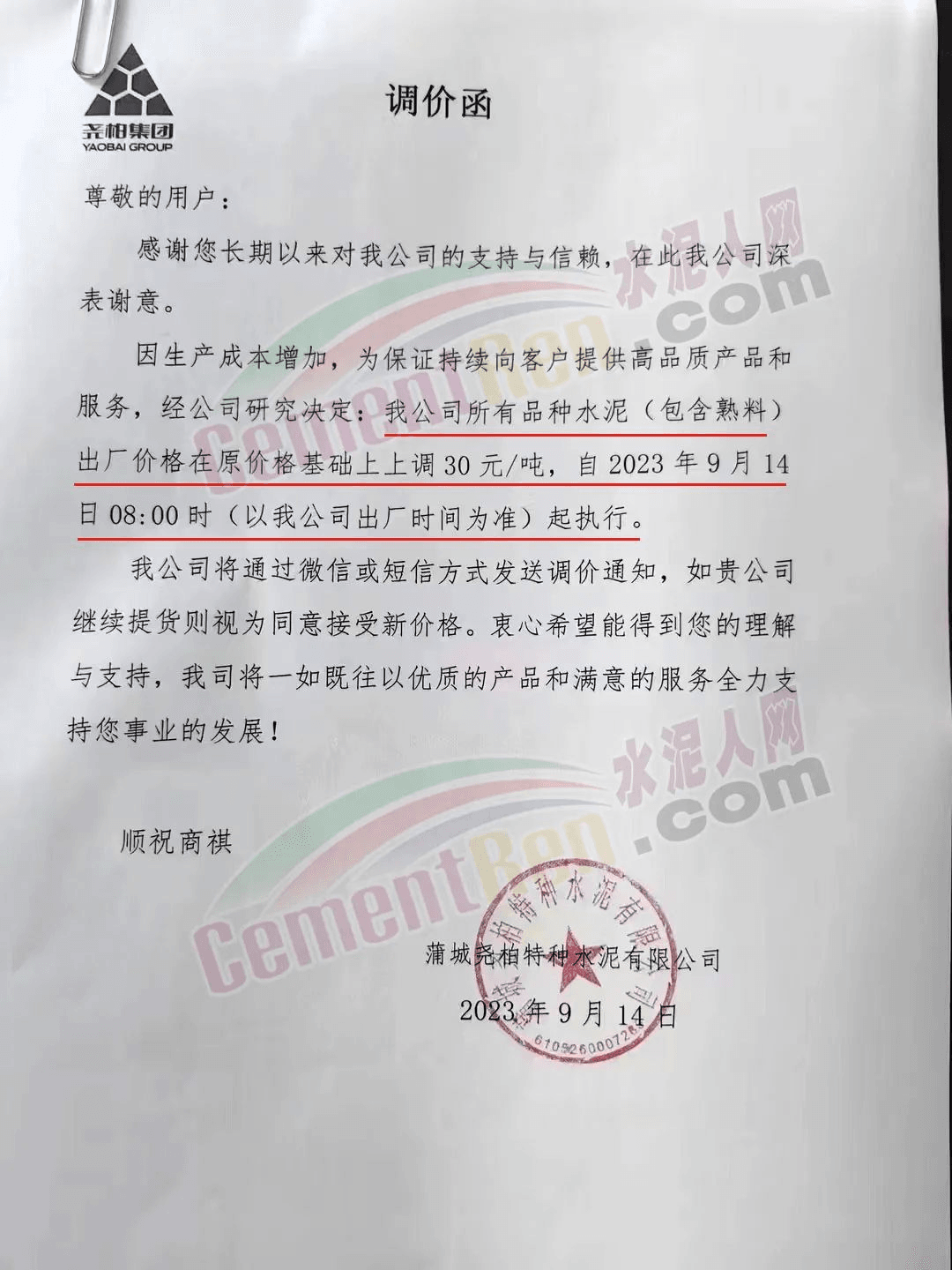 華新金龍水泥(鄖縣)有限公司通知,鑒于當(dāng)前原材料價(jià)格上漲,及市場(chǎng)行情變化,公司決定于2023年9月14日起所有品種水泥價(jià)格上調(diào)30元/噸。