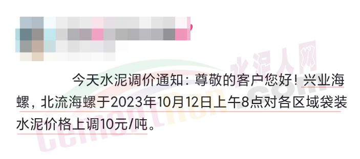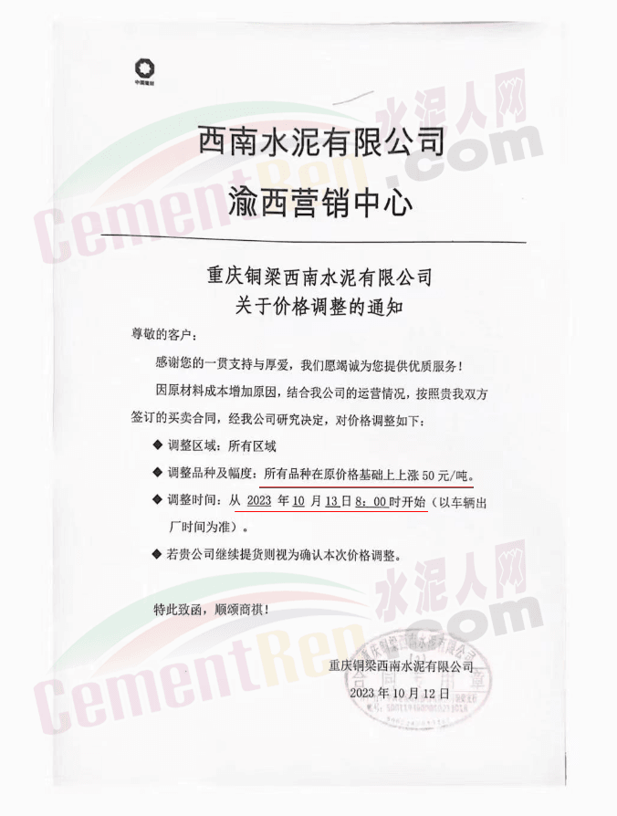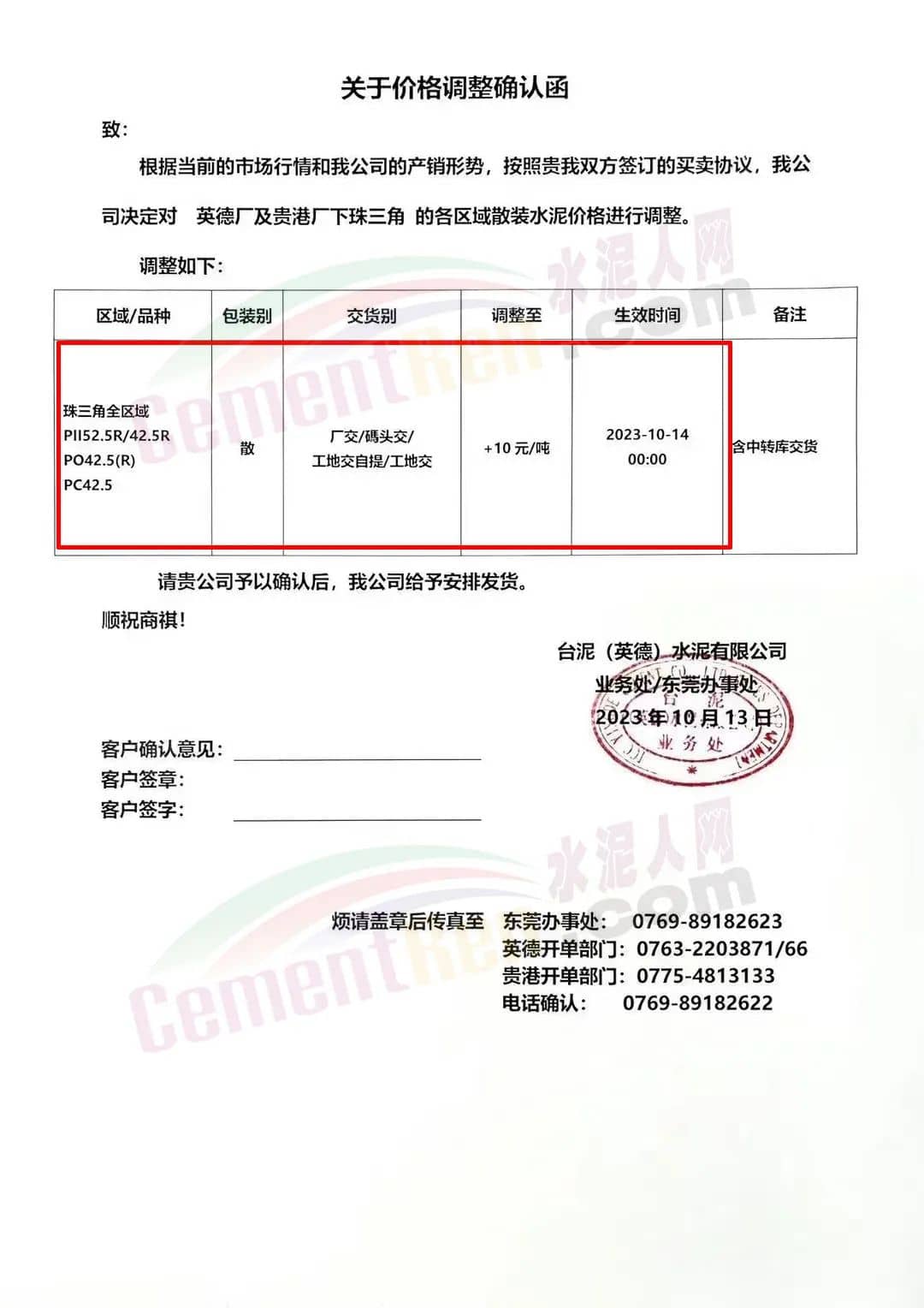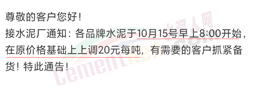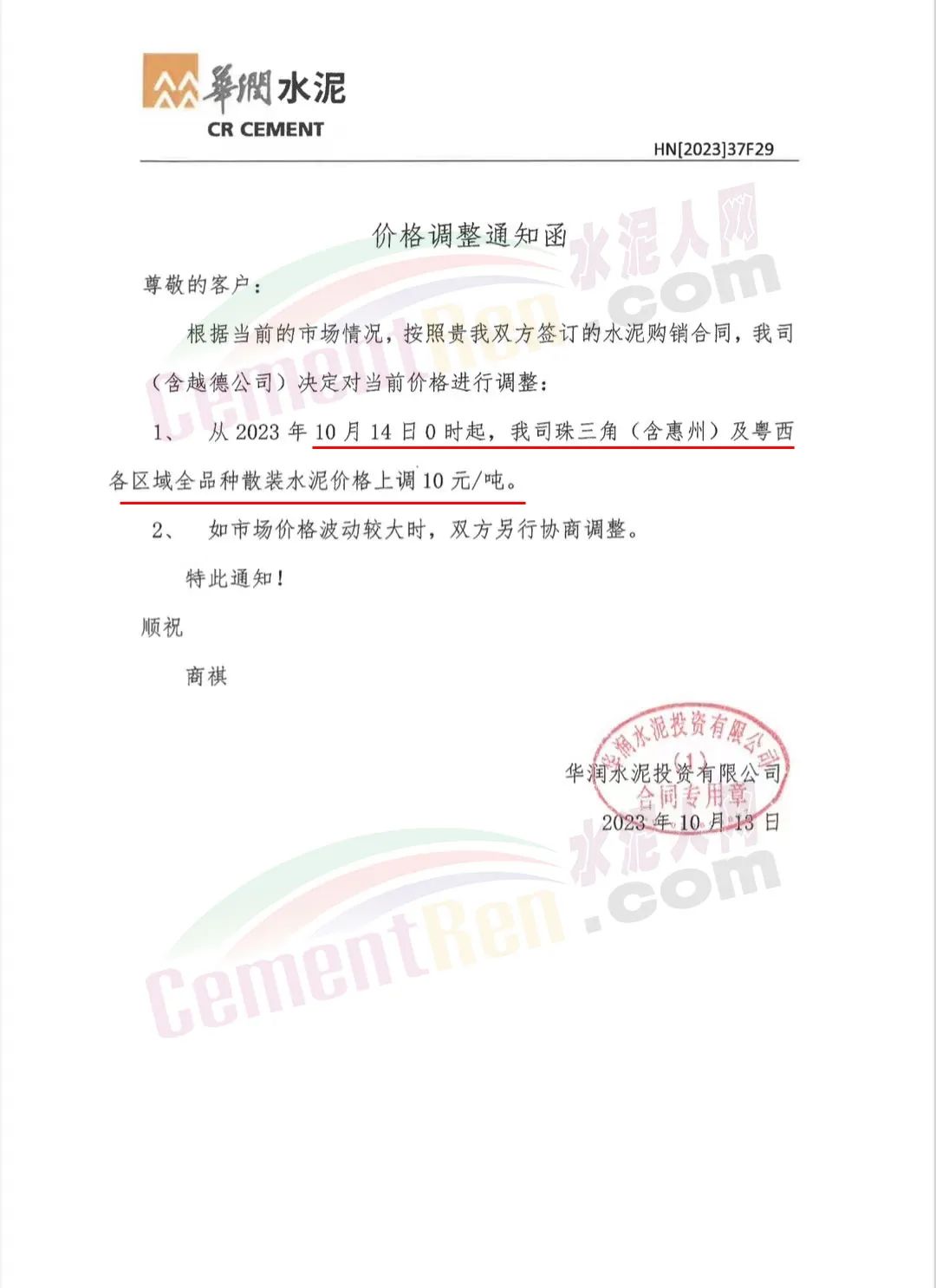 10月13日,廣東多區域經銷商收到通知,水泥價格將于14日起上調10元/噸。華潤水泥投資有限公司通知,自10月14日0時起,公司珠三角(含惠州)及粵西各區域全品種散裝水泥價格上調10元/噸。