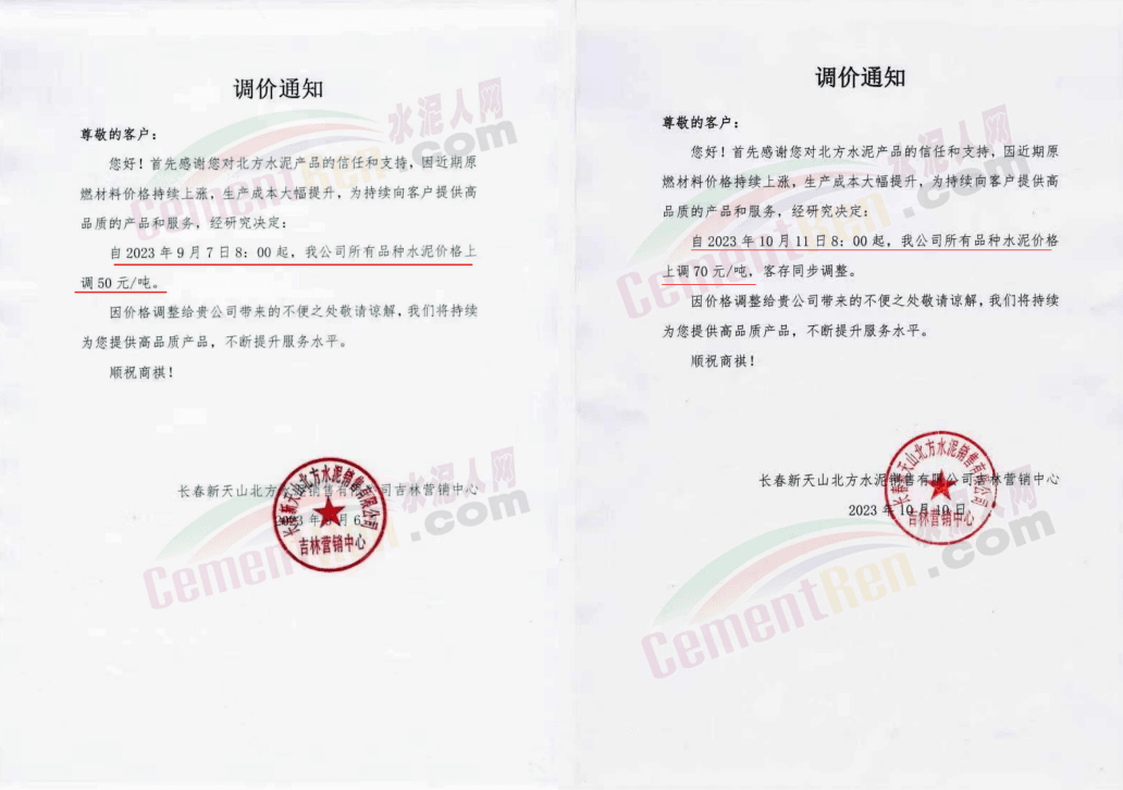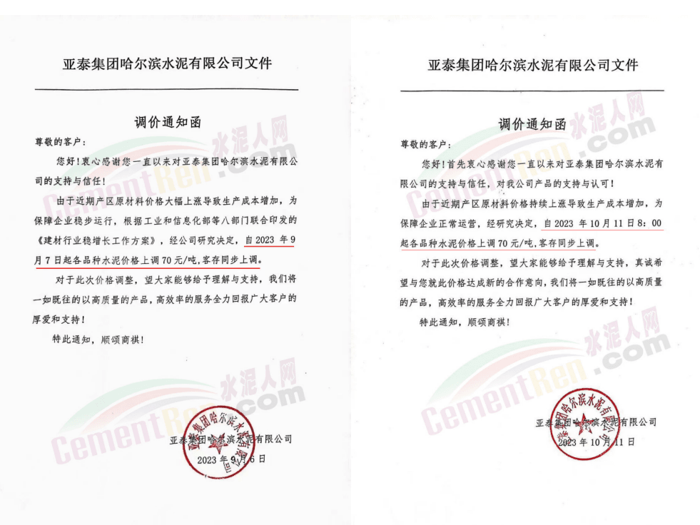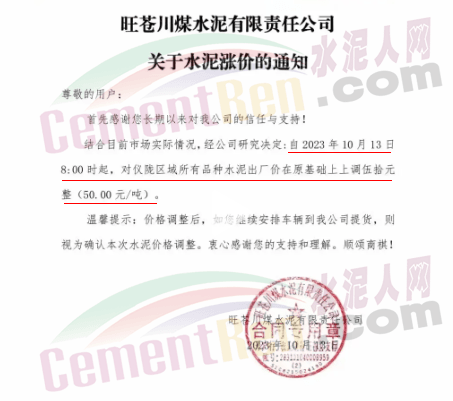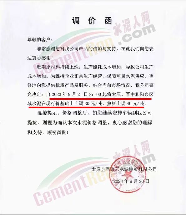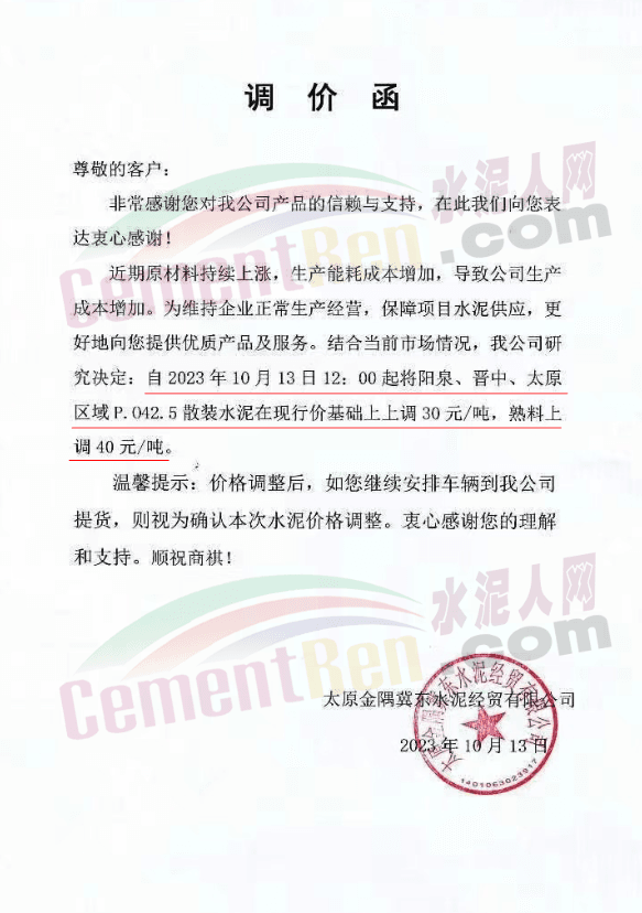 日前,山西太原金隅冀東水泥經貿有限公司通知稱,近期原材料持續上漲,生產能耗成本增加,導致公司生產成本增加。為維持企業正常生產經營,結合當前市場情況,公司研究決定,自2023年10月13日08:00起將左權公司全品種水泥在現行價基礎上上調50元/噸,熟料上調40元/噸。自12時起將陽泉、晉中太原區域PO425散裝水泥在現行價基礎上上調30元/噸,熟料上調40元/噸。