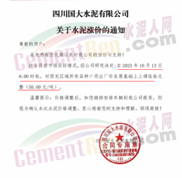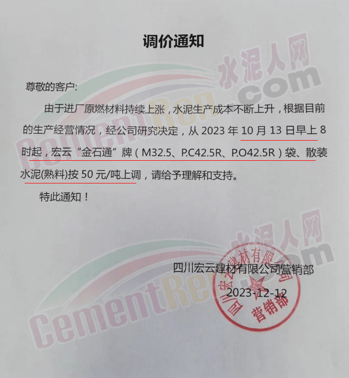 同日,川渝區域華新、西南、富豐、小南海等多家品牌水泥通知上調水泥報價50元/噸。