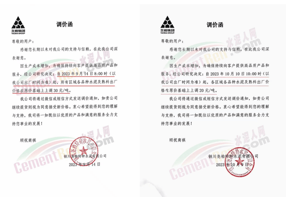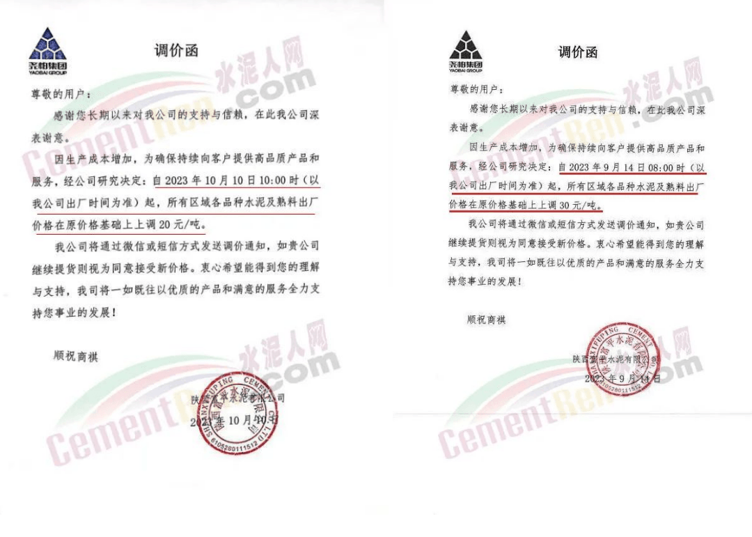 陜西關中區域主要品牌企業堯柏、冀東等分別于9月中旬和10月中旬兩次上調報價,累計上調50元/噸。