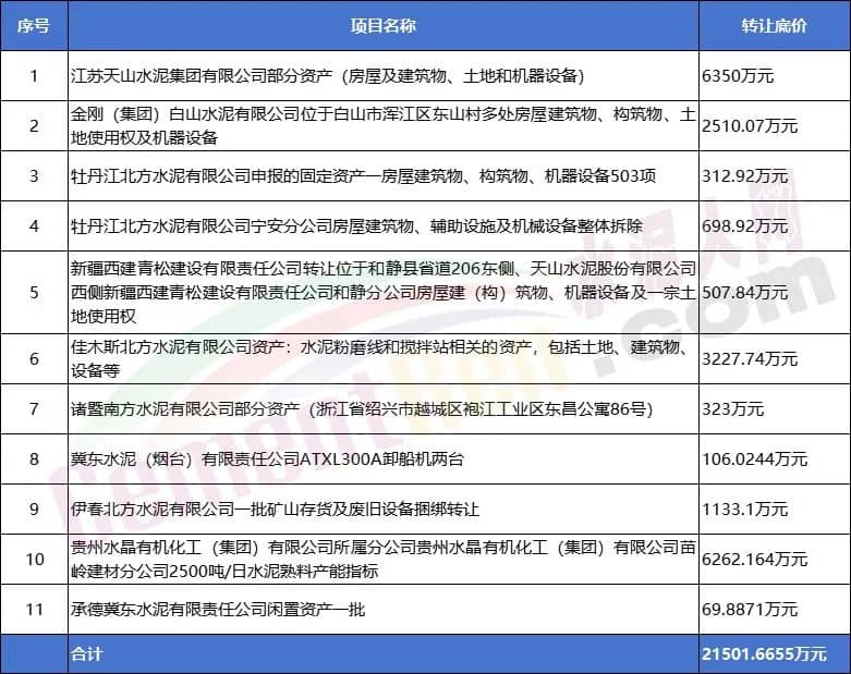 據查詢,截至目前正在披露的11個水泥廠相關轉讓項目中包含房屋、建筑物、土地使用權、機器設備、熟料產能指標、股權、債權等,轉讓底價合計2.15億。正在披露中的項目,除股權、債權外,多為企業廢舊資源及低效資產。