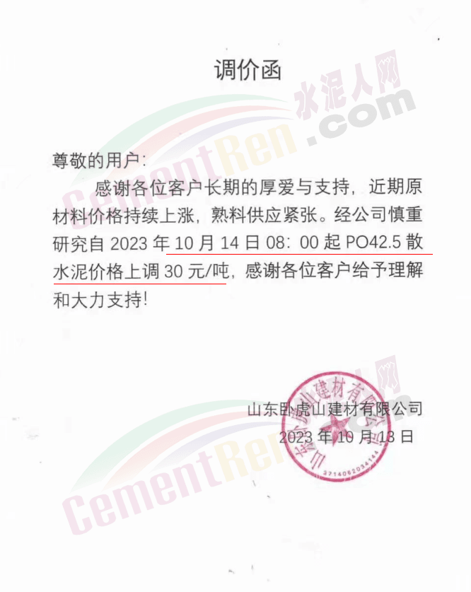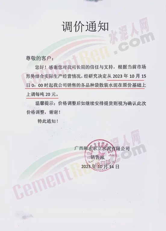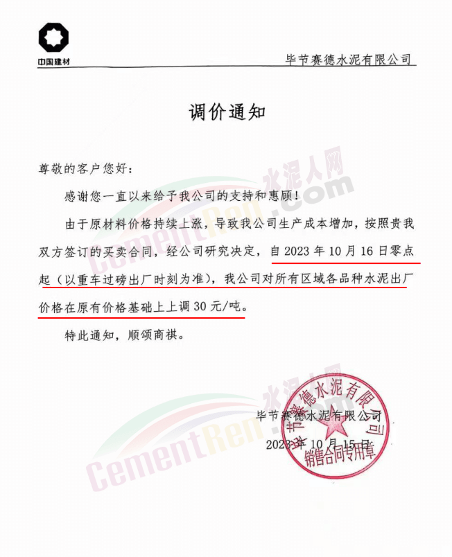 畢節(jié)賽德水泥有限公司通知,由于原材料價(jià)格持續(xù)上漲,導(dǎo)致公司生產(chǎn)成本增加,經(jīng)公司研究決定,自2023年10月16日零點(diǎn)起,對(duì)所有區(qū)域各品種水泥出廠價(jià)格在原有價(jià)格基礎(chǔ)上上調(diào)30元/噸。