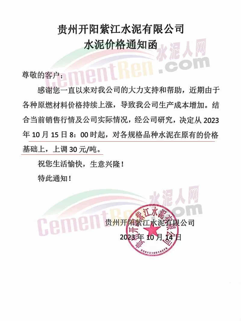 貴州開陽紫江水泥通知,近期由于各種原燃材料價(jià)格持續(xù)上漲,導(dǎo)致公司生產(chǎn)成本增加。結(jié)合當(dāng)前銷售行情及公司實(shí)際情況,經(jīng)公司研究,決定從2023年10月15日8時(shí)起,對(duì)各規(guī)格品種水泥在原有價(jià)格基礎(chǔ)上,上調(diào)30元/噸。
