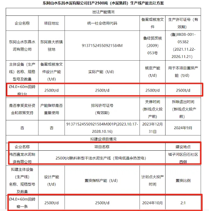 而在2024年7月24日,根據(jù)山東省工信廳發(fā)布的《東阿山水東昌水泥有限公司產(chǎn)能出讓轉(zhuǎn)移方案公告》,東阿山水東昌水泥有限公司將1條2500t/d的水泥熟料生產(chǎn)線指標(biāo)置換給雞西賽龍水泥制造有限公司,建設(shè)一條Ø4.0×60m回轉(zhuǎn)窯。
