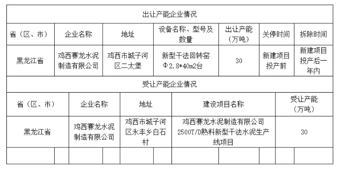 而在此之前,2019年8月19日,黑龍江省工業(yè)和信息化廳發(fā)布的《雞西賽龍水泥制造有限公司熟料產(chǎn)能出讓公告》顯示,雞西賽龍水泥制造有限公司出讓30萬(wàn)噸/年新型干法回轉(zhuǎn)窯2.8*40m2臺(tái)給雞西賽龍水泥制造有限公司建設(shè)2500t/d熟料新型干法水泥生產(chǎn)線項(xiàng)目。